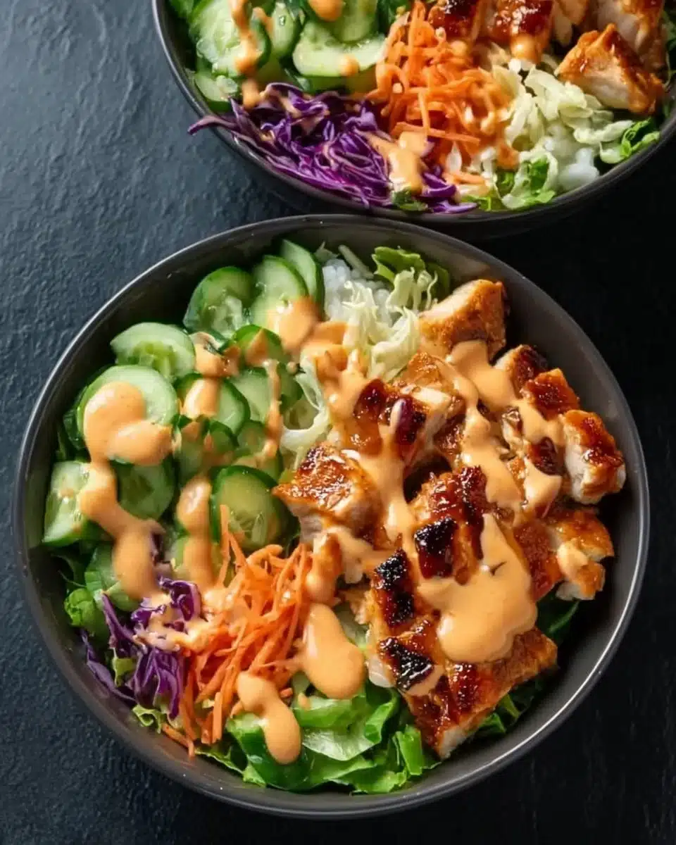 A quick and nourishing bowl filled with crispy chicken, bright vegetables, and a spicy mayo sauce, perfect for busy weeknights.