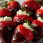 Delicious strawberries filled with a creamy cheesecake mixture and coated in rich chocolate, perfect for family gatherings or a sweet treat.