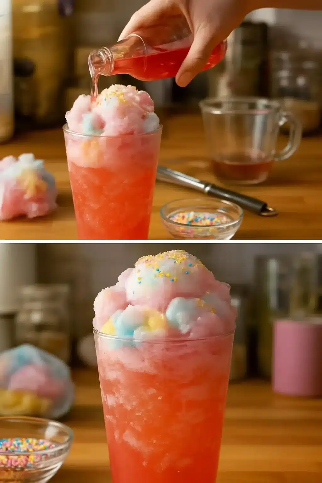 I remember an afternoon when it poured rain and the whole building smelled like wet pavement. I pulled out a bag of cotton candy, a bottle of sparkling water, and a few cherries from the fridge. The kids gathered at the counter with wide eyes as the sugar hit the glass and bloomed into color. We sipped, we laughed, and we felt like it was a small festival right in our kitchen. If you like playful drinks or festive flavors, you might also enjoy a sweet cookie to go with it as a treat; I often pair these sips with festive bites like these holiday candy cane cookies when family comes over.
