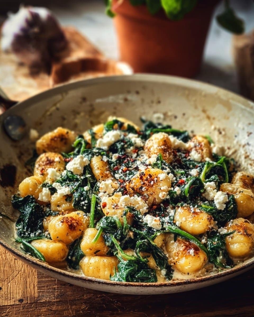 A comforting and quick recipe of creamy gnocchi combined with fresh spinach and feta, perfect for busy weeknight dinners.