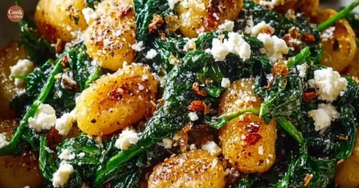 Take a moment to appreciate the ingredients. The pillowy gnocchi, bright green spinach, creamy feta, and fragrant garlic work together beautifully. I always suggest using fresh spinach if you can; it gives the dish that garden brightness.