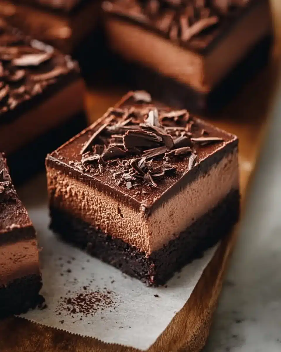 Pair this dessert with simple coffee or a small glass of milk for kids. For grown-ups, a dollop of lightly sweetened whipped cream or a sprinkle of flaky salt brightens the flavors. If you are hosting, slice into neat squares and serve on a warm plate with a small fork. The contrast of textures the fudgy base and airy mousse always sparks conversation, and the dessert disappears fast.