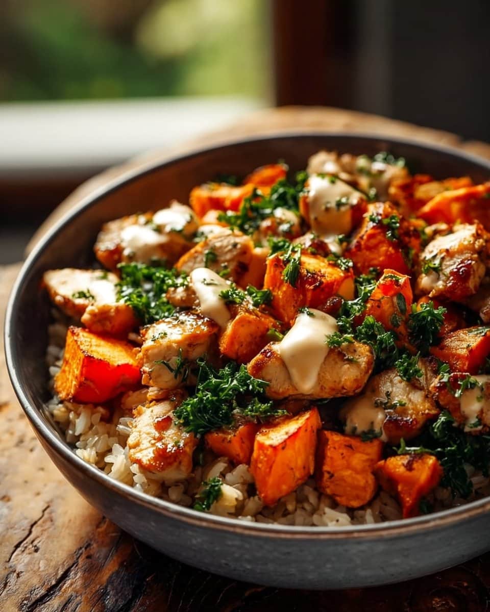 A comforting and nutritious bowl featuring roasted sweet potatoes, tender chicken, and brown rice, perfect for busy weeknight dinners.