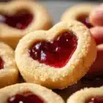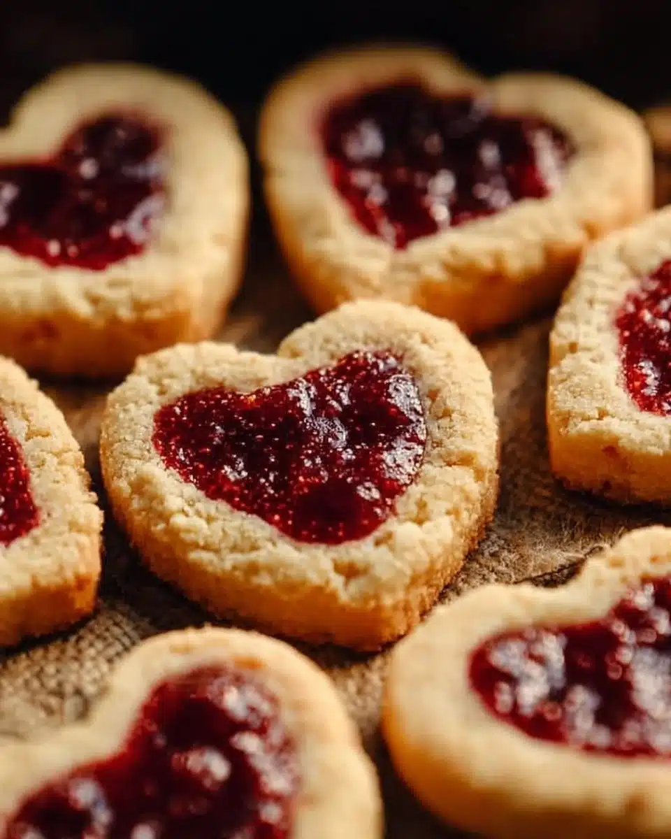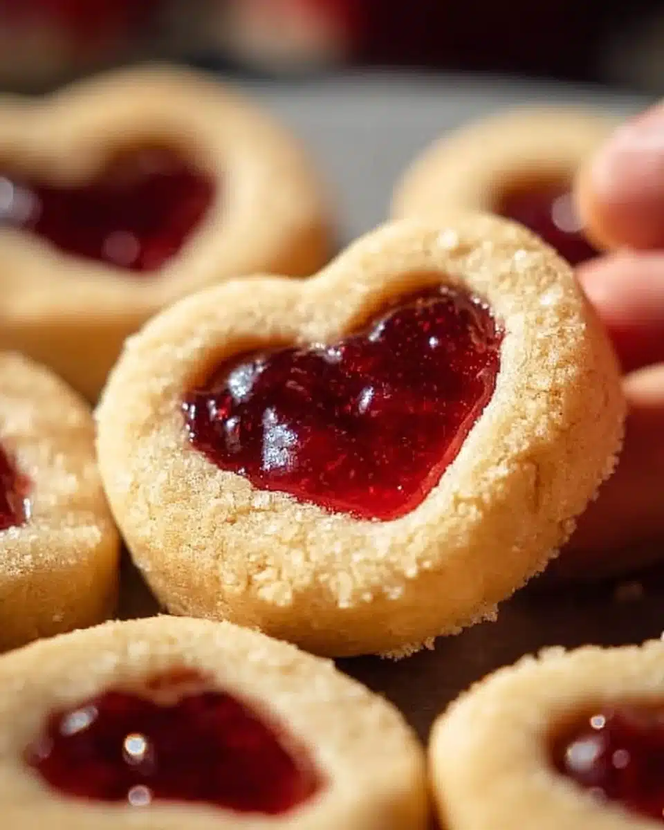 Before you list the ingredients, take a breath. The kitchen will smell warm and cozy as the butter creams with sugar. The dough looks pale and soft. When you press that pinky into the top, the heart holds its shape like a small promise. Meanwhile, the jam ripples with color. Once it’s ready, the oven hums, and you wait for the edges to whisper golden.