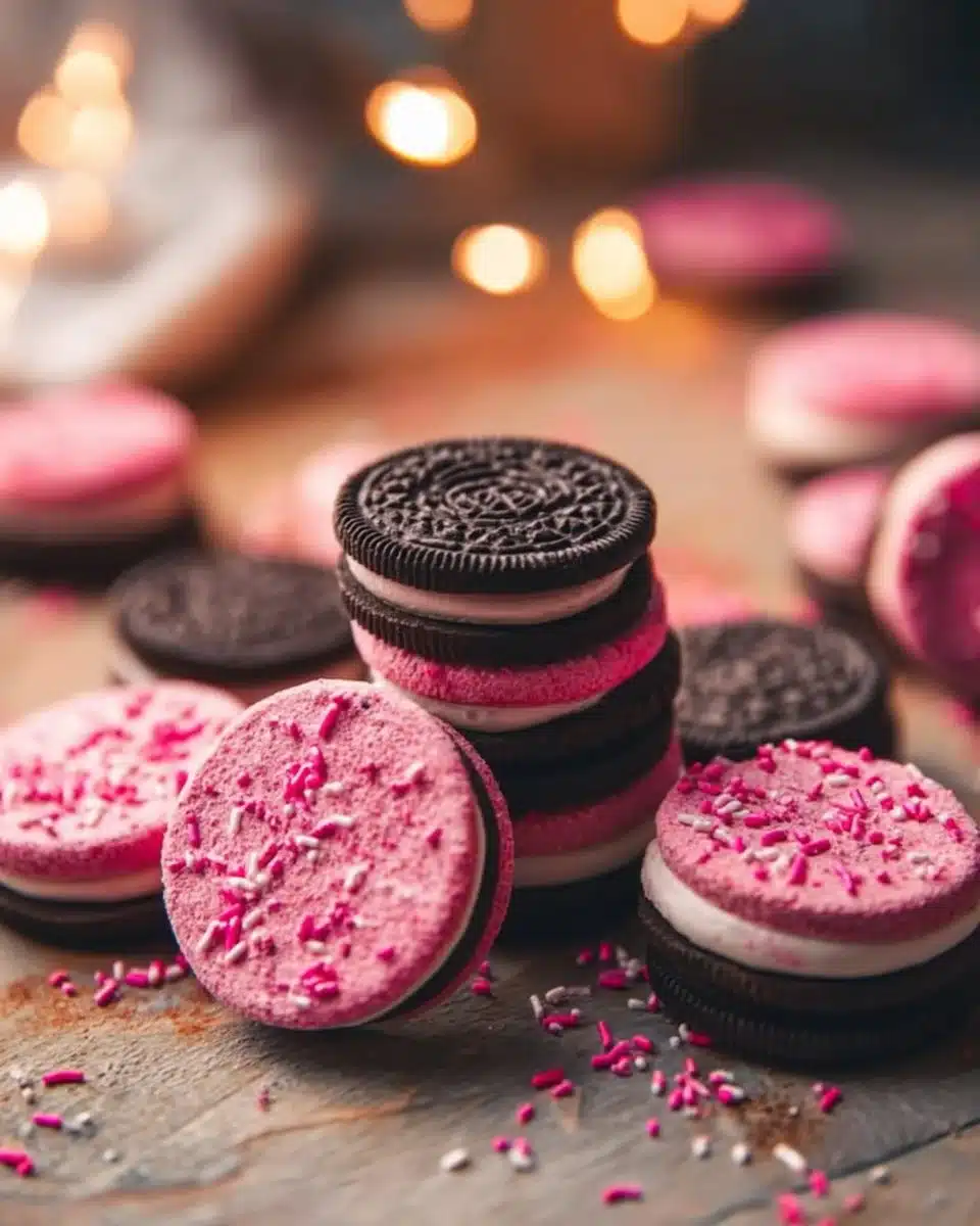 I remember the first time I made these pink, candy-coated Oreos for a school bake sale. The apartment smelled like sugar and bright, warm vanilla. My youngest sat on the counter with sticky hands while she carefully chose the sprinkles. The cookie crust gave a quiet, crisp snap when you bit in. Meanwhile, the candy coating set into a glossy shell that caught the light. That small, silly moment felt like a mini celebration in our busy week.