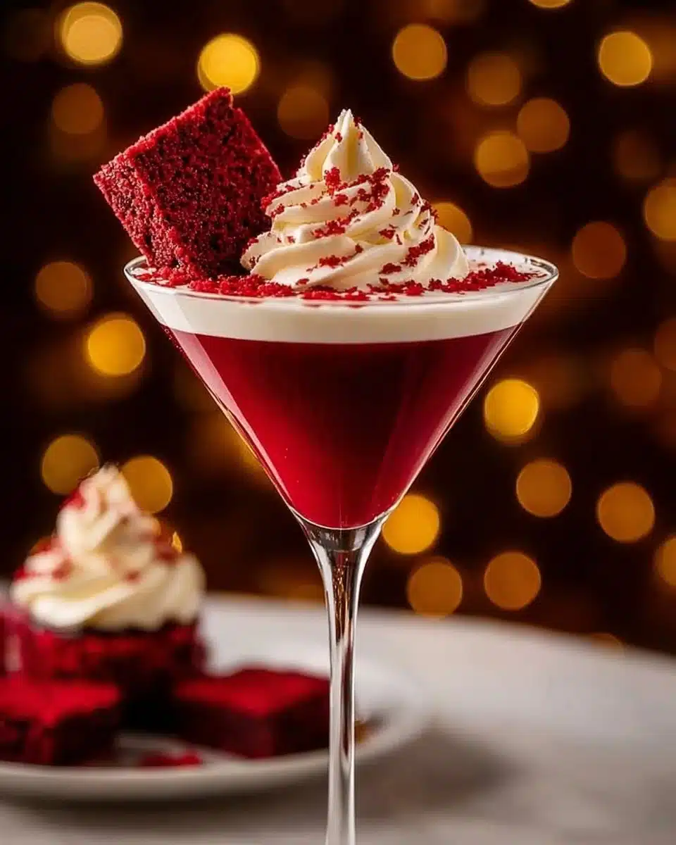 A grown-up dessert in a glass, this Decadent Red Velvet Martini blends chocolate, cream, and a touch of nostalgia for a delightful celebration.