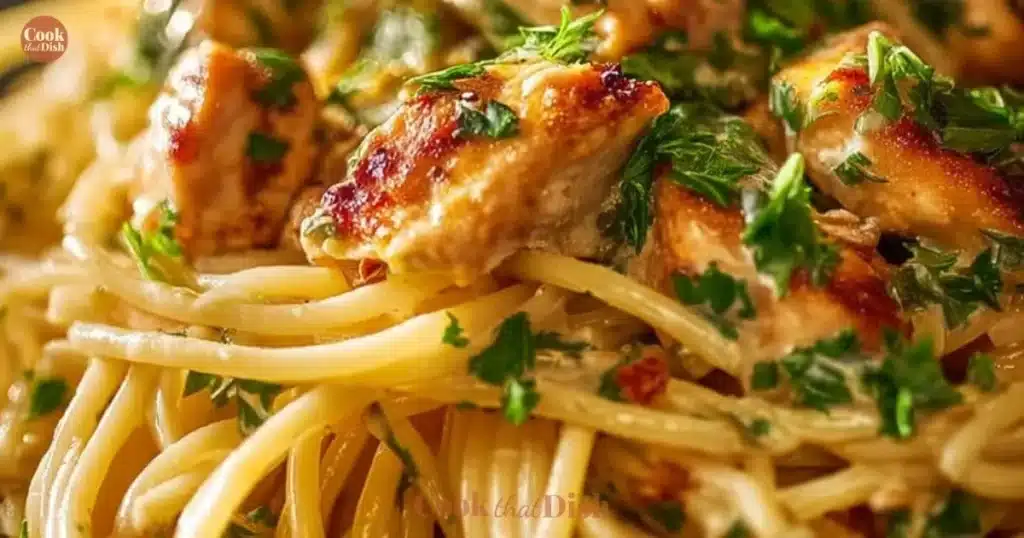 Plate of Monterey Chicken Spaghetti garnished with herbs and vegetables