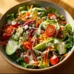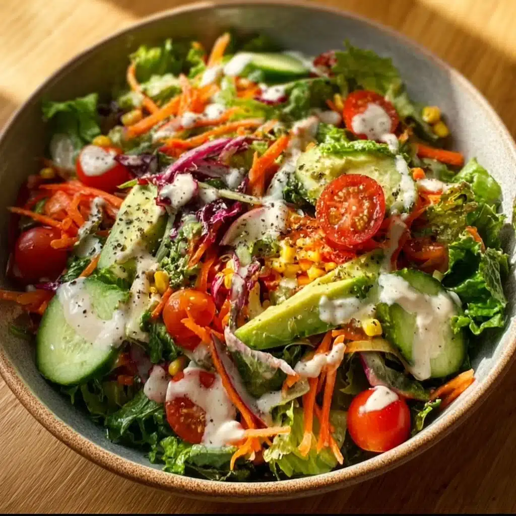 This salad is a weeknight friend. It takes the tired idea of lettuce and tomatoes and lifts it with crunch, cream, and a little kick. The creamy dressing clings to crisp leaves and roasted corn. From there, the colors pop — deep greens, ruby tomatoes, orange carrots, and bright avocado. The result feels like a small celebration of what’s left in the fridge.